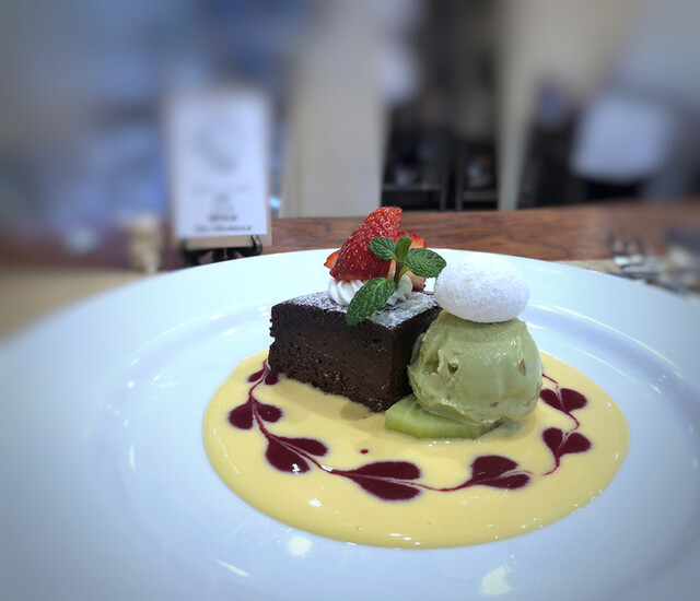・生ガトーショコラ、ピスタチオアイス・・ガトーショコラは甘さ控えめで食後に丁度いい品。