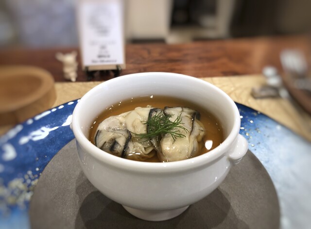 牡蠣は大粒で低温調理かしら、火入れが良く美味しく、フランとコンソメソースも合いいいお味です。