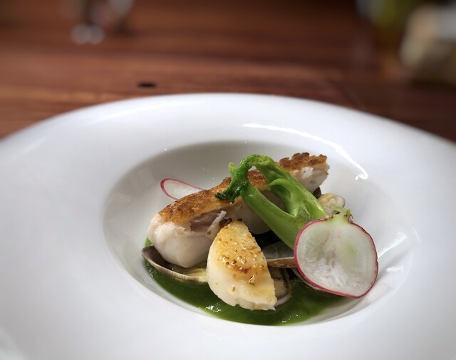 ・真鯛に食パンをのせて焼いたポアレ、帆立、蕾菜、菜の花ピューレ、アサリ、