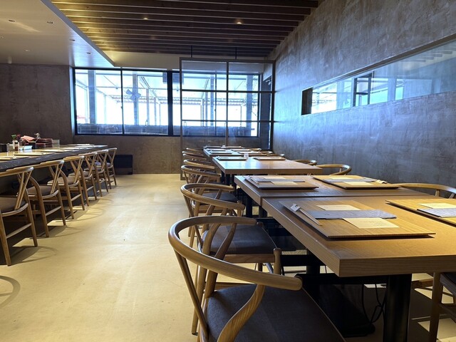 「お肉とお魚を使用したコース料理」や「BBQ」「カフェ」などを愉しめます。コース料理のお食事は、BBQスペースの奥(入り口を入ってすぐ)で別空間。カウンター席とテーブル席があります。