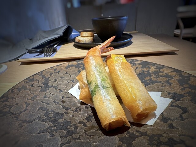 ・お魚コースの「一品料理」は「海老」と「サツマイモ」「蕪」の春巻き。