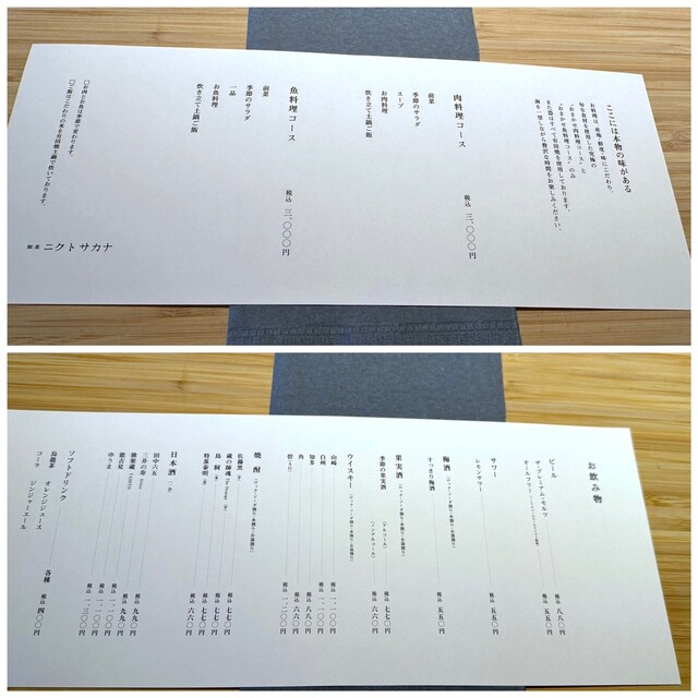 3,300円コースは、お茶菓子が付かずお魚とお肉のポーションが、4,400円と比べそれぞれ6割程度になるそうです。予約はお店のインスタからTablecheck経由で、4,400円コースを予約しました。