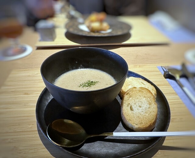 ・お肉コースの「スープ」・・茸と豆乳のスープ、バケット添え。