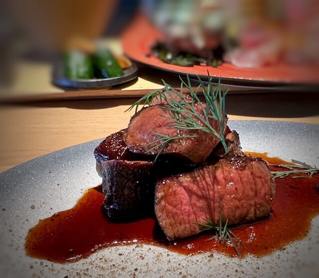 鹿肉が美しいですね。全くクセがなく火入れも絶妙です。洋梨のピューレやマスタード、赤ワインソース等と頂くとお味の変化も愉しめます。