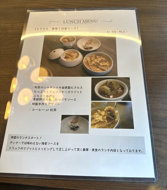 ランチは、訪問時は「とりぴえ豪華3段重(2,000円:税込)」、1種類のみでした。