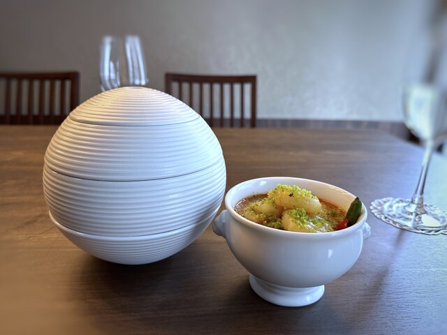 ジャガイモや夏野菜も色々入り、海老の旨味を感じ美味しい。アメリケーヌとは若干違いますけれど、好み。