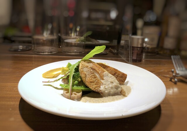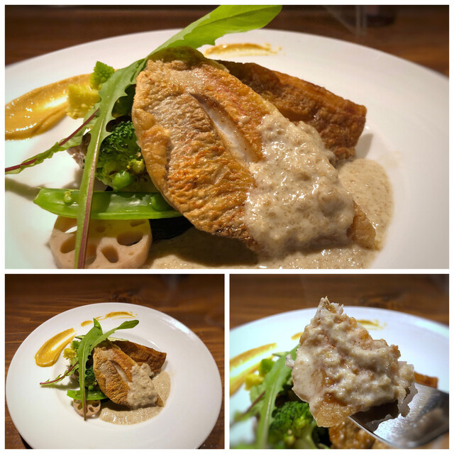 レンコダイはカリッと焼かれ食感もいいこと。マッシュルームソースはマッシュルームの濃厚な味わいを感じいいお味。一緒に頂くと美味しいですね。