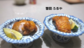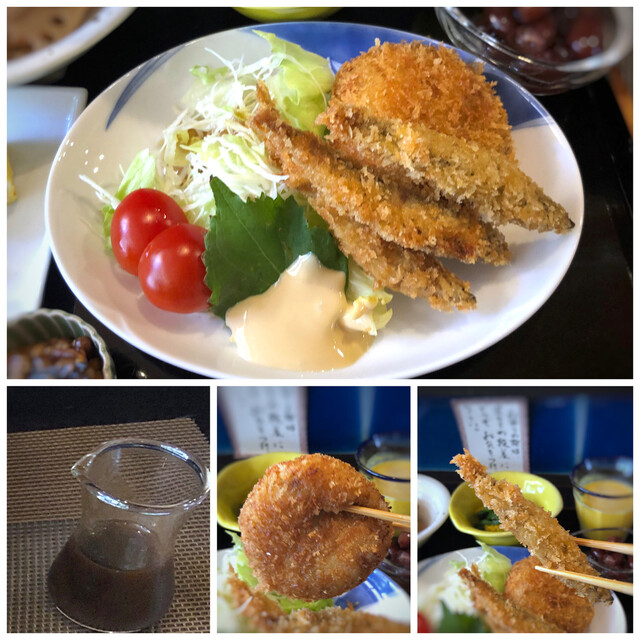 ・主菜「コロッケとキビナゴのフライ」、ソースが添えられています。