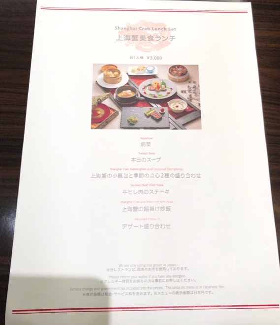 頂いたのは「上海蟹美食ランチ(3000円)、期間限定」。内容は「前菜盛り合わせ」「鮑のスープ」「上海蟹の小籠包、翡翠餃子、焼売」「牛ヒレ肉のステーキ」「上海蟹の餡かけ炒飯」「デザート3種」など。「上海蟹コース」ではないので、小籠包と炒飯の餡程度でしか味わえませんでしたけれど、お味やボリューム共に満足ランチでした。ホテルらしくサービスも丁寧で、一人利用しやすいのも便利です。
