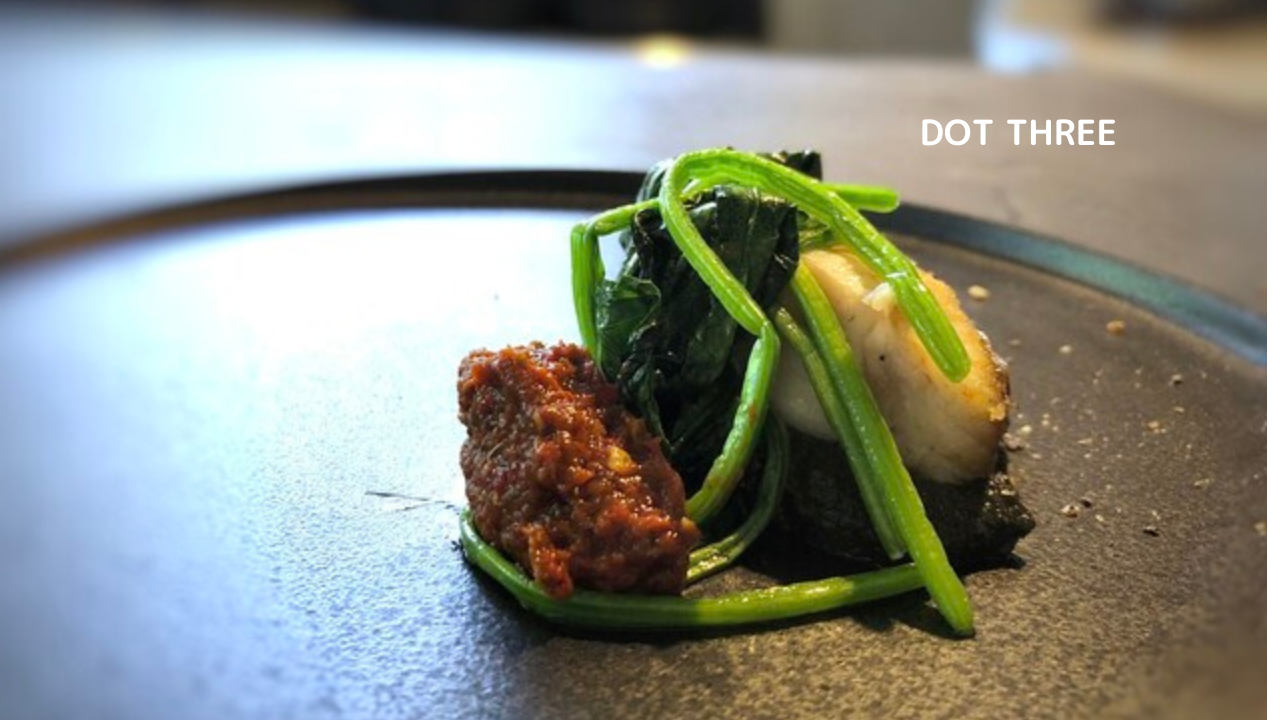 ・お魚料理・・この日は「鰆のソテー」、ほうれん草、竹炭となんとかのソース、唐辛子とパクチのペースト