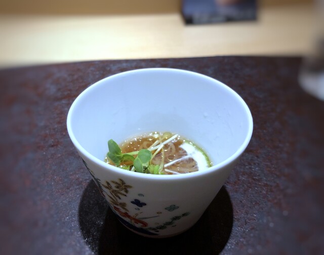 麺は二口ほど。かぼすの軽い酸味で頂く優しい味わいのスープ。