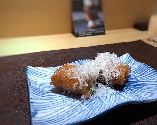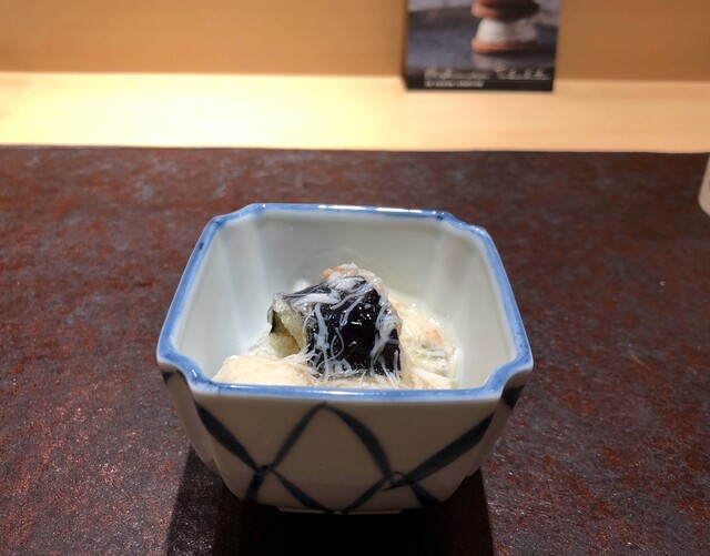 茄子の天ぷらは目の前で揚げられ熱々。蟹たっぷりの餡が美味しいですね。