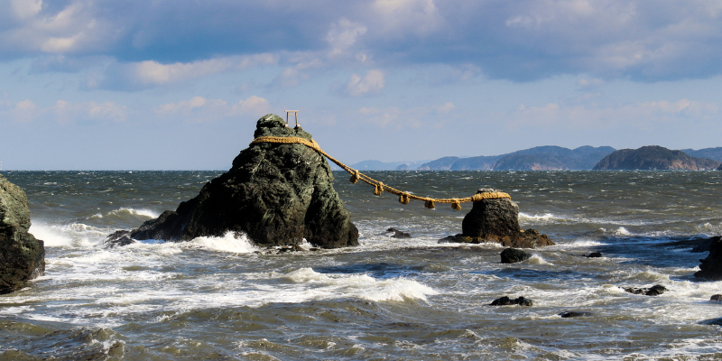 岩がお互いに寄り添っており、その姿が夫婦を連想させることから「夫婦岩」と呼ばれています。