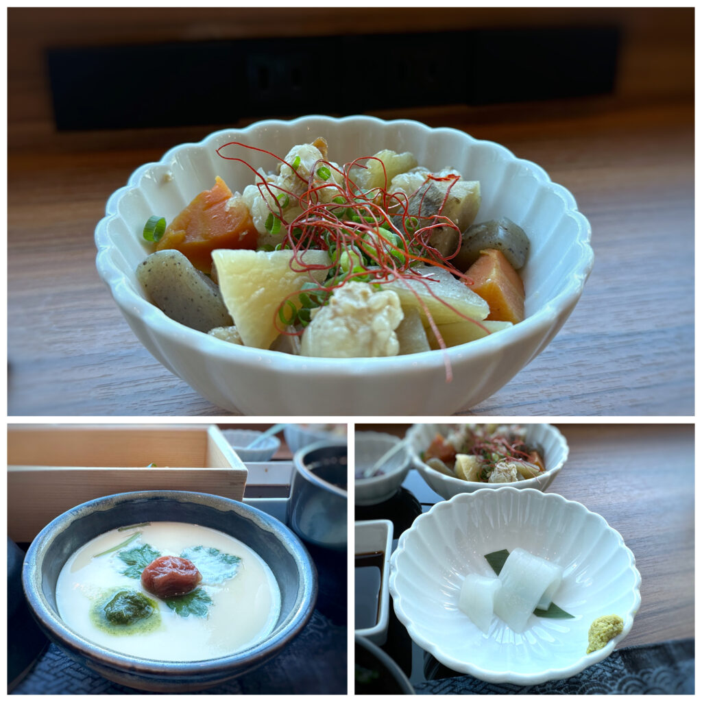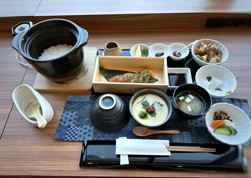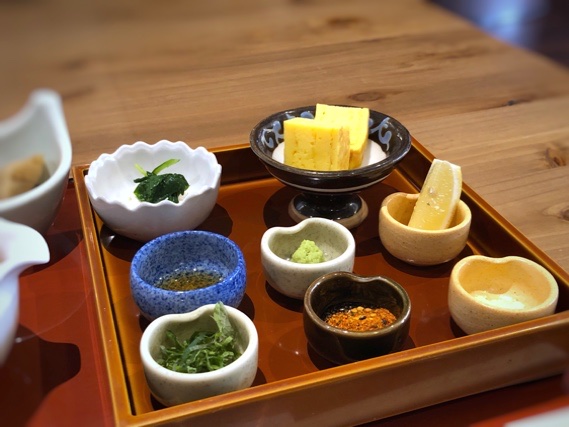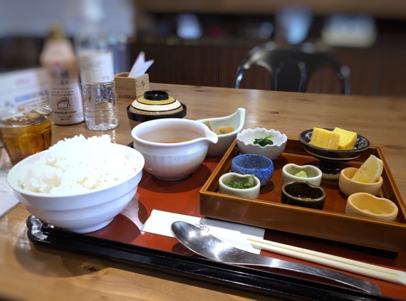 品数が多く「できたてめんたい(海苔佃煮、大葉とレモン、梅はちみつ添えでお味の変化を愉しめます)」「釜焚きご飯」「うまだし茶碗蒸し(上には春菊のピューレ)」「いかのお刺身」「国産和牛もつの味噌煮込み」「山芋とろろ(うまだし入り)」「お味噌汁」「お漬物」など、盛り沢山。ご飯はお茶碗に2膳弱程度。