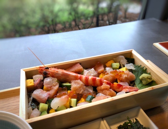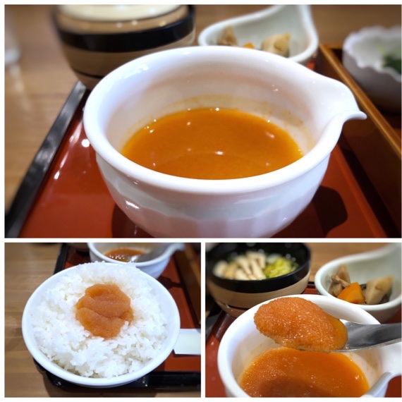 頂いたのは「博多めんたい織 ~海鮮重~」中央に大きな「海老」、「できたて明太子」、玄海灘の鯛、「間八」「いくらの自家製醬油漬け」が盛られビジュアルが美しいですね。最初は「海鮮重」で頂き、お出しが用意されているので「お茶漬け」でと2度愉しめます。