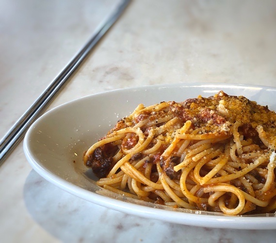 頂いたのは「ボロネーゼ」、パンとサラダ付きで1480円。粗挽きの挽肉もタップリ、ミートソースの味わいが濃厚で美味しいパスタ。後日夜に利用した際は「チーズ」がたっぷりかけられていました。那珂川に面しているので、夏以外のお天気のいい日はテラスで頂くと気持ちがいいかもしれません。女子会やデートにも向いています。