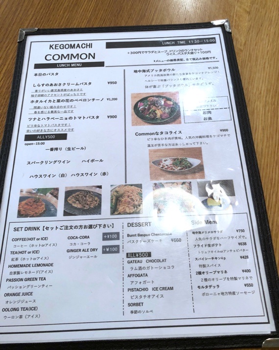 🍽️ ケゴマチコモン・・店内は広く一人でもゆっくり出来ます。ランチはパスタなどがメインで、夜はアルコールやタパス類も豊富なようです。