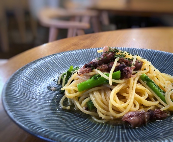頂いたのは「蛍烏賊と菜の花のペペロンチーノ(1,200円)」に「サラダ+スープ+ドリンクセット(300円)」を追加しました。