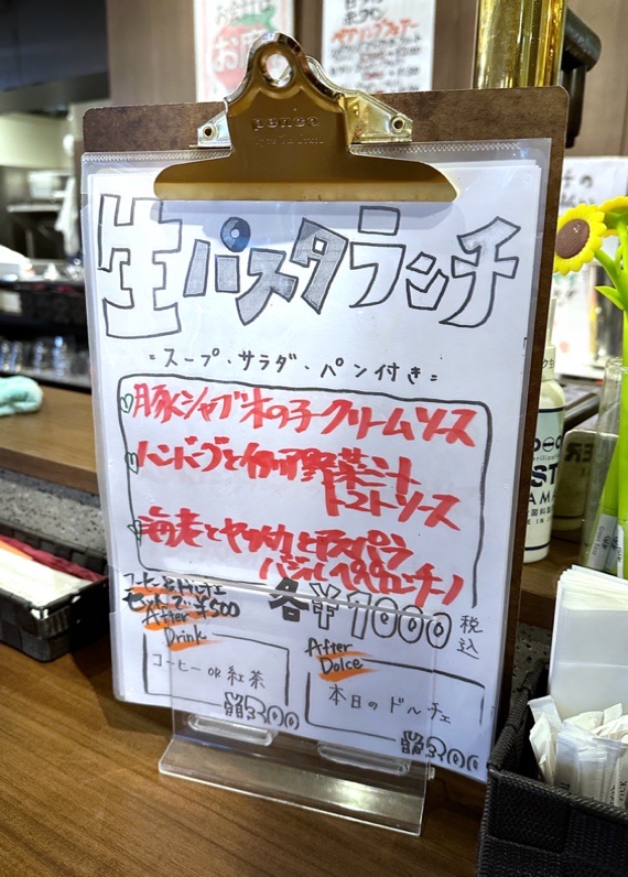 頂いたのは「生パスタランチ」の「ハンバーグとイタリア野菜ミートソース(1,000円)」ラダ、パスタ、スープのセット。ハンバーグとイタリア野菜ミートソース、生パスタは「フェットチーネ」で、ボリュームたっぷりでした。懐かしい味わいのお料理ですけれど、お手頃にランチをいただけます。