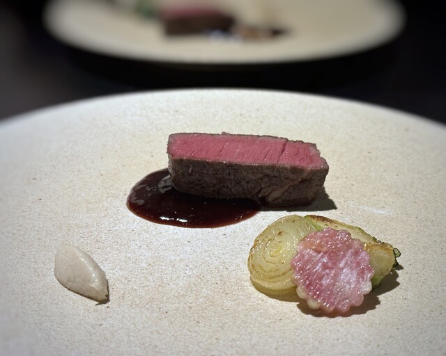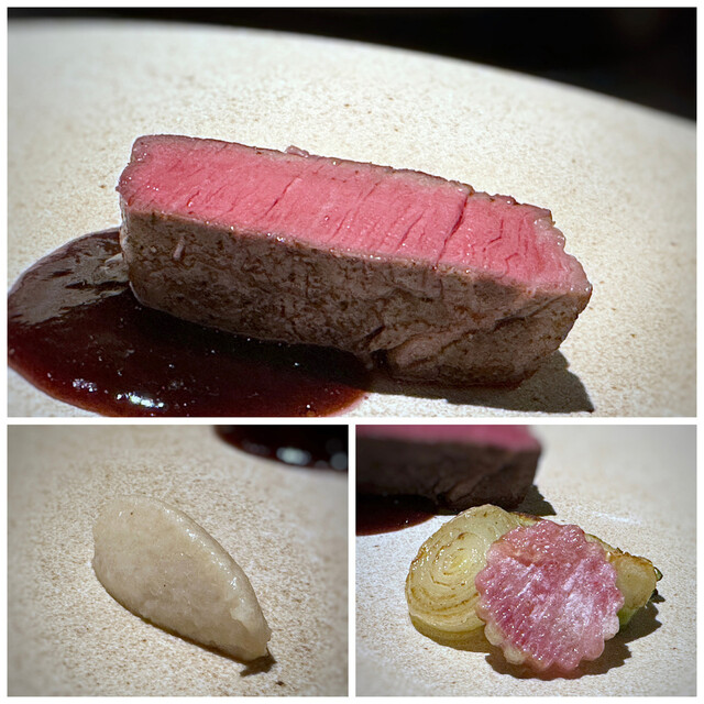 ・ニュージーランド産牧草牛のフィレ、牛スジと和出汁のお醤油のソース、エノキ麹