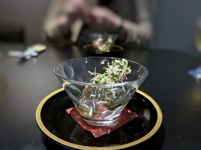 ◆鮪とイサキの焼き霜、葉山葵と海苔の佃煮のジュレ・・京都と違い福岡では焼き霜を出すお店が少ないので、久しぶり。鮪も質のいい品ですけれど、イサキが美味しいですね。ジュレの味わいも良く、一緒に頂くと美味しい。