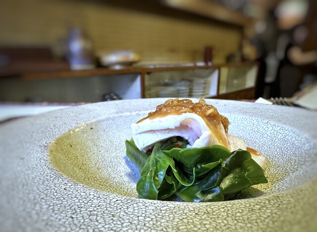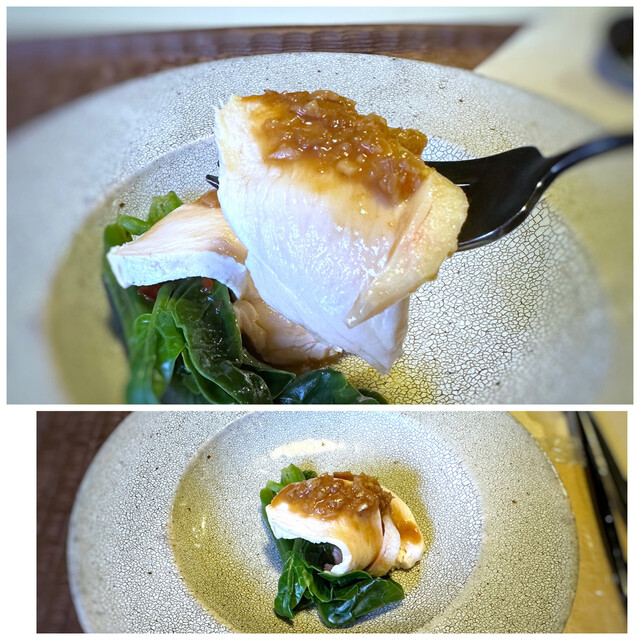・前菜・・蒸し鶏とツルムラサキ風のお野菜に少し辛めのソースがかけられています。