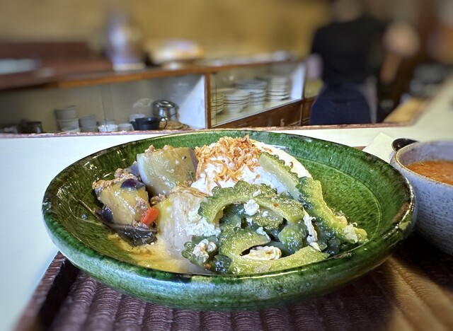 ・ライスには「茄子の挽肉炒め」「何とかカボチャ」「ゴーヤチャンプル風」が添えられています。