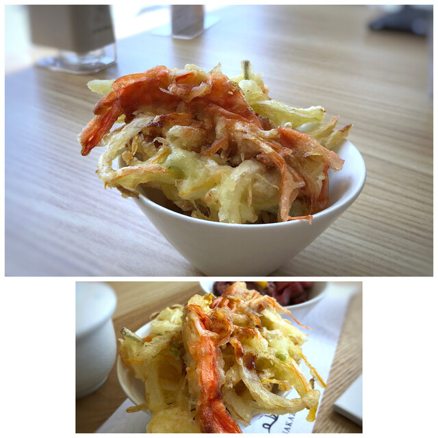 ・かき揚げ丼・・小さめの海老一尾とお野菜のかき揚げ。揚げ置きですので、少し衣が硬いかしら。