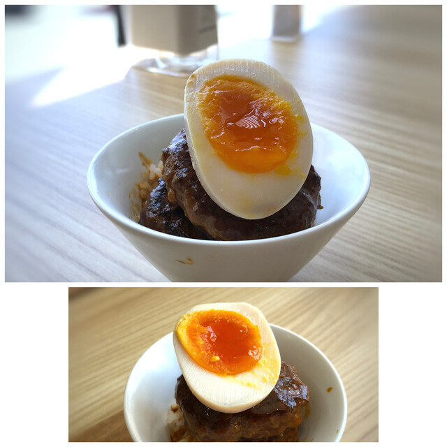・ハンバーグ丼・・ミニサイズのハンバーグが2個、その上に煮玉子。少し甘めのタレで。