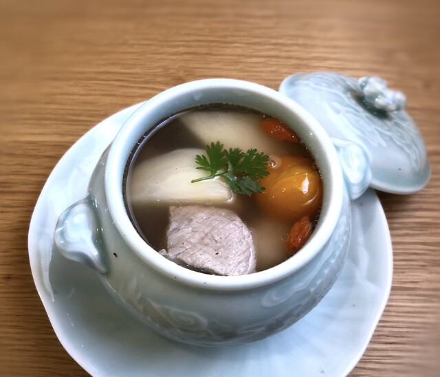 ・薬膳蒸し・・スペアリブ、メロン、里芋、ミニトマト、蓮根、クコの実等を干し貝柱で出汁を取ったスープで煮込まれています。優しい味わいで、体の中から浄化されそうですね。