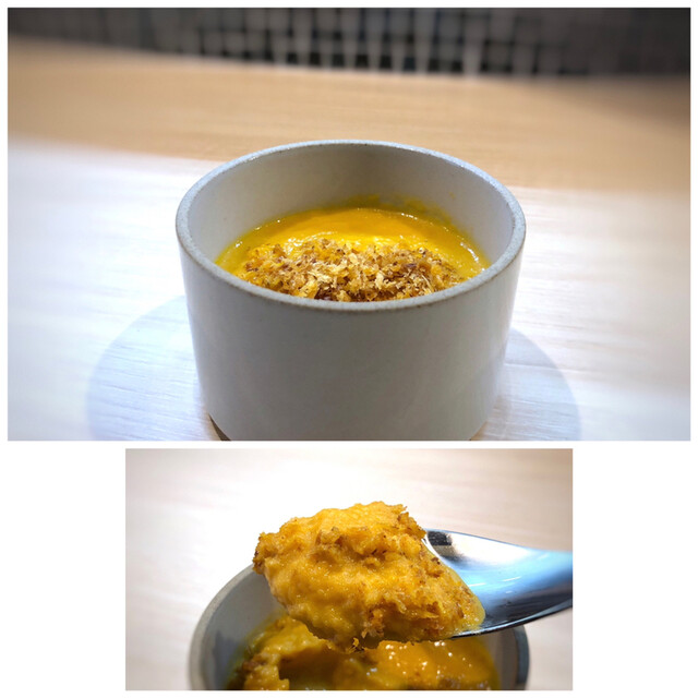 ◆人参のスープ、チョリソー風味のパン粉のせ・・スープというよりスムージー的な印象を受けたのですけれど、人参の旨味や甘味を感じます。