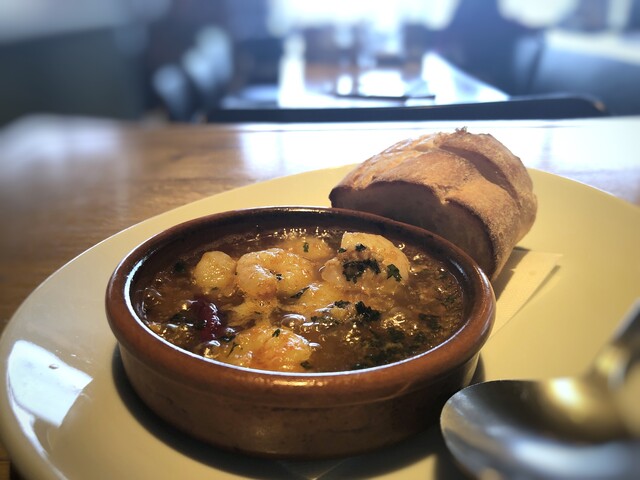 ・海老のアヒージョ、バケット付。小海老は7個、オリーブオイルをパンに漬けながらいただくと美味しいですね。