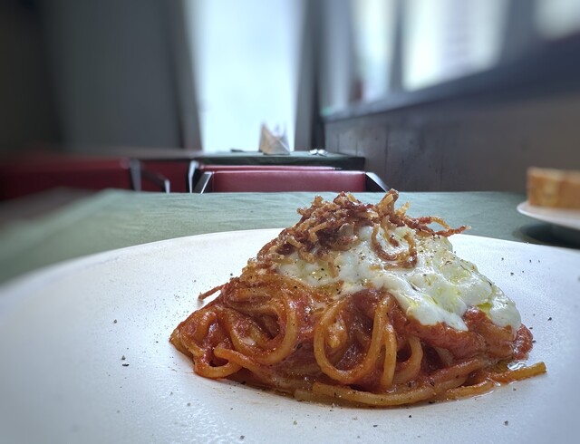 トマトソースは見た目通り濃厚で、昨今の甘いトマトとは違い、いい意味で昔ながらの酸味や甘みを感じ美味しいソース。パスタは自家製麺だそうですけれど、丁度いいアルデンテ。
