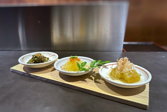 毎回2,750円のコースを頂きますが、内容がよく美味しいですね。季節の前菜3種、蒸し物、お造り5種、揚げ物、煮物、