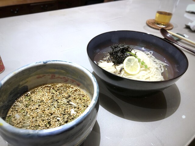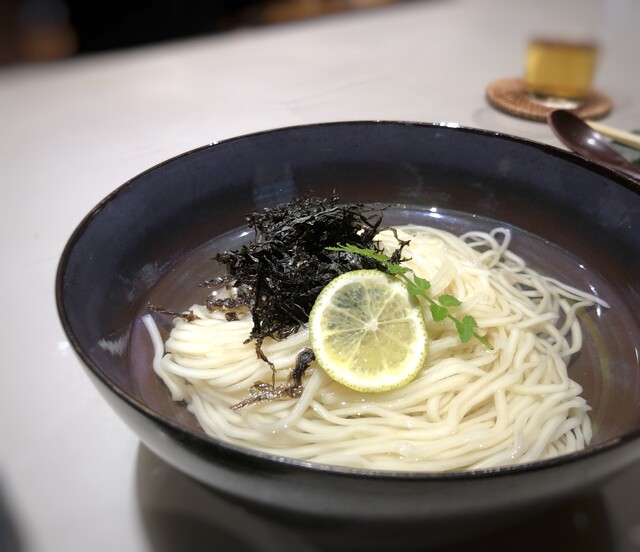 麺は平打ちで食感がよく、昆布水に浸されています。お味見しましたら、軽く昆布の味わいが。