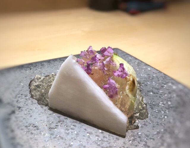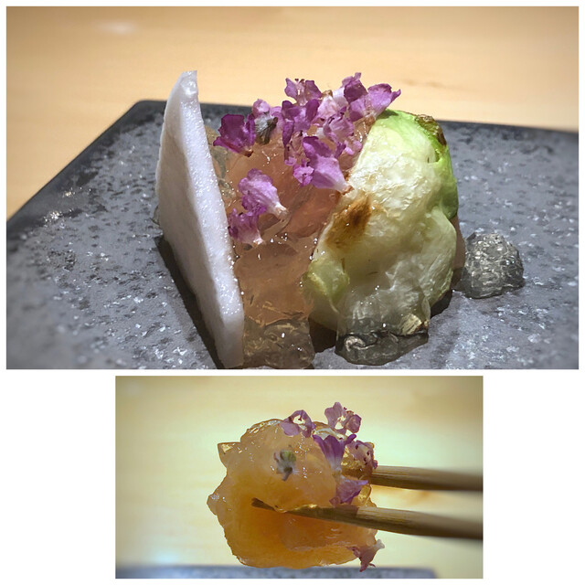 ・胸肉の昆布〆、蕪、鶏出汁のジュレ