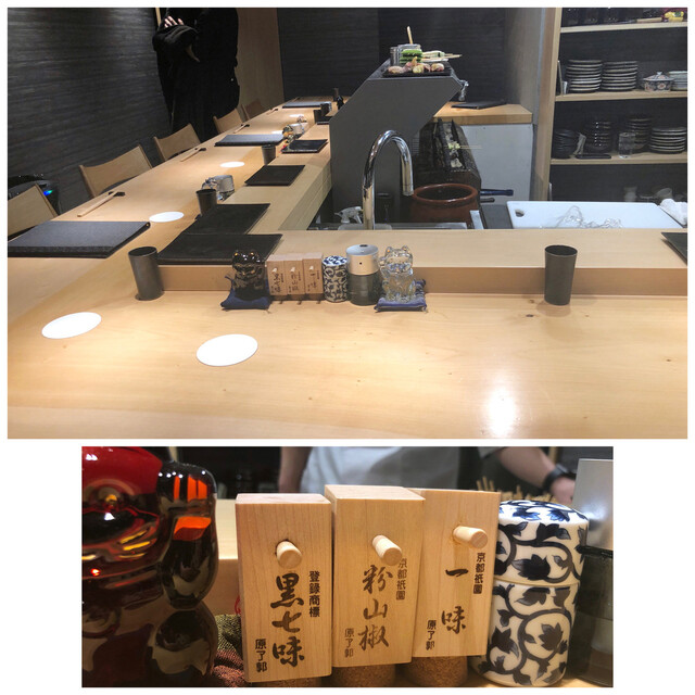 カウンターには京都の人気店「原了郭」の黒七味などが。
